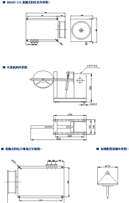● 本料位儀傳感器動力部分采用0.59kW、6級三相制動電機,并經(jīng)59:1減速裝置,采用φ5mm鋼絲繩掛錘,其傳動功率大,錘頭的提升力矩大,可有效地防止埋錘及斷纜事故,料倉在進料或出料同時都可以進行料位自動檢測。